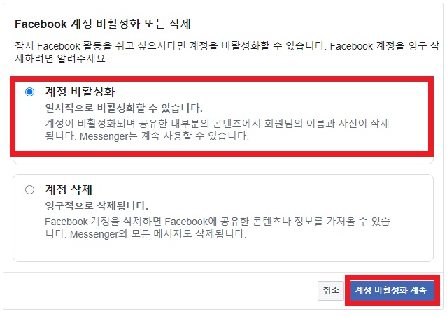 이후 [계정 비활성화]를 클릭하시면 페이스북 계정 비활성화가 완료됩니다.