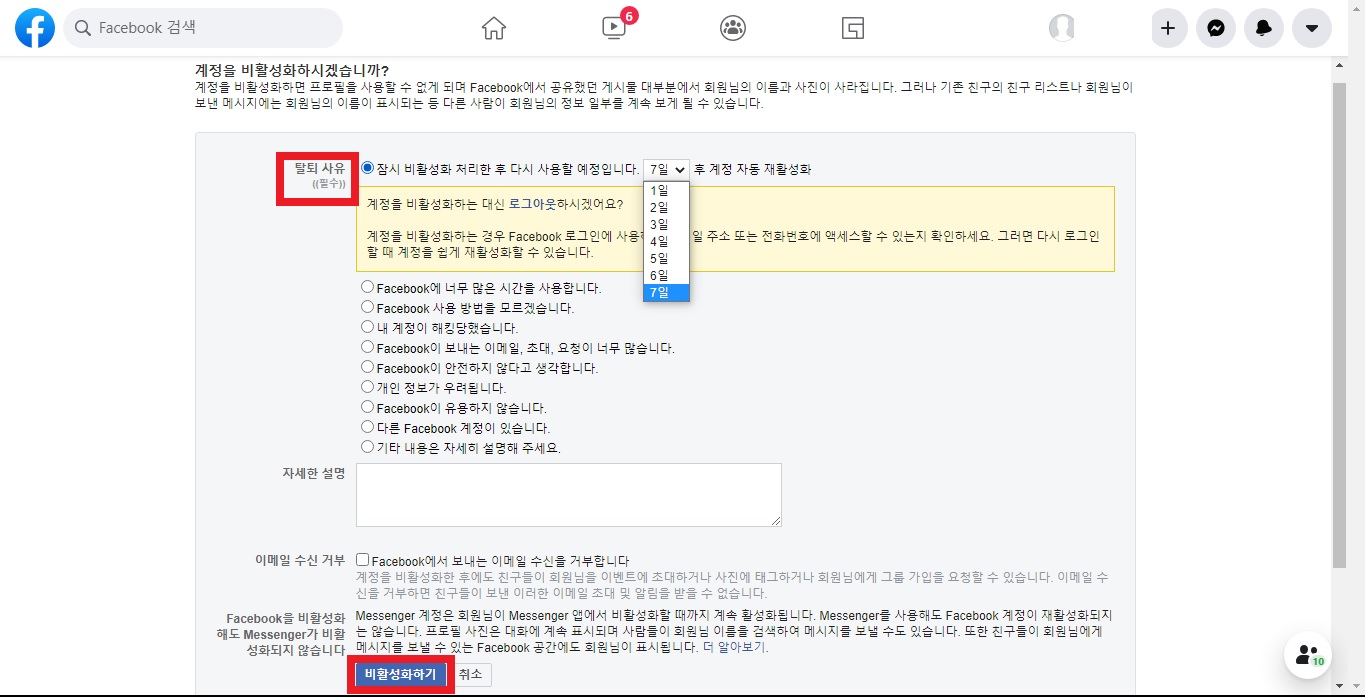 이때, 페이스북 비활성화를 하면 일정 기간 동안 알림 받지 않고 나중에 다시 들어가서