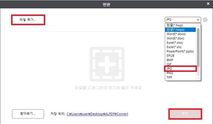 3. 파일 선택 후 JPG를 선택하고 변환하기를 클릭한다.