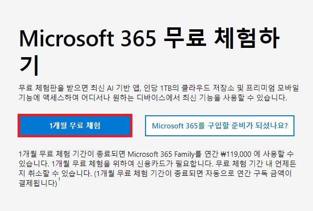 사이트에서 가정용을 클릭하시면 이 화면이 나옵니다. 가정용은 1년에 119,000원인데, 사실 1년마다 비용을 지불해야 하니 조금 비싸죠? 밑에 보시면 1개월 무료 체험이 있는데, 1개월 동안은 무료로 이용하실 수 있습니다.
