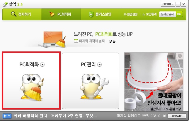 다음으로 PC 최적화 방법입니다. 두 번째 탭 PC 최적화를 클릭 후 빨간색 네모를 클릭합니다.