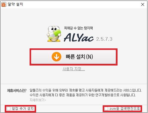 이후 나오는 창에서 빠른 설치를 클릭합니다. 밑에 보시면 알집 추가 설치와 zum을 검색엔진으로 라고 되어있는데, 사용하실 분들은 그대로 냅두시면 되고, 사용하지 않으실 분들은 체크 해제해주시면 됩니다.