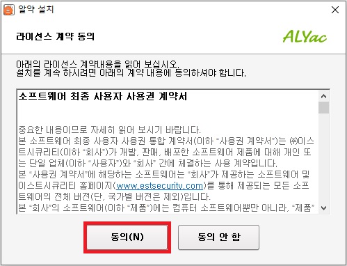 다음으로 알약 설치 창이 생성되는데, 여기서 동의를 클릭합니다.
