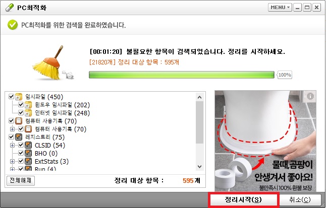 PC 최적화를 하면 불필요한 항목을 종류별로 나열하는데, 정리 시작을 누르시면 PC 최적화가 완료됩니다.