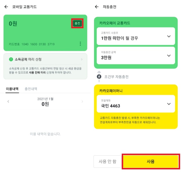4. 충전금액을 입력하시거나 선택 후 충전을 하시는데 자동충전을 이용하실 분들은 조건부 자동충전을 설정하시면 됩니다. 사용하지 않으실 분들은 안 하셔도 됩니다.