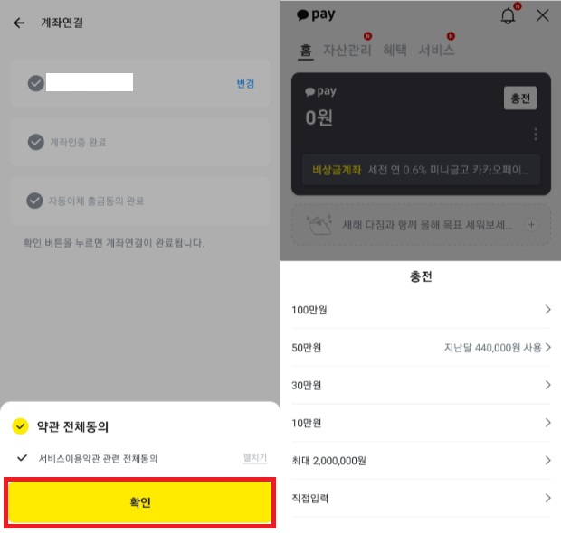 카카오페이는 충전 후 사용하는 방식인데요, 충전 금액을 선택하시거나 직접 입력하셔서 충전하시면 됩니다.