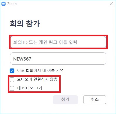 4. 오디오에 연결하지 않음과 내 비디오 끄기를 확인하시고 참가를 클릭하시면 zoom 화상회의에 접속됩니다.