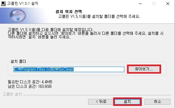 7. 고클린 프로그램 설치 폴더를 확인하시고 설치를 클릭합니다.