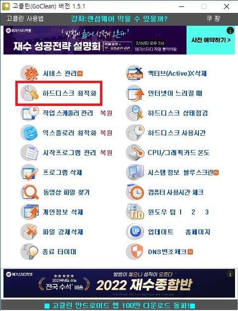 설치한 고클린 프로그램을 실행시키면 위 사진과 같이 창이 뜹니다. 최적화 프로그램이니 하드디스크 최적화를 한번 해보도록 하겠습니다. 하드디스크 최적화를 클릭해주세요!