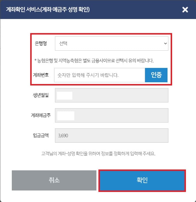 10. 마지막으로 계좌인증을 진행합니다. 내용 입력하시고 인증을 클릭하시면 바로 됩니다. 확인을 눌러 마무리합니다.