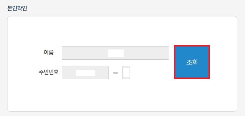6. 본인확인을 한번 더 진행합니다. 내용 입력하시고 조회 클릭하신 후 다음으로 넘어갑니다.