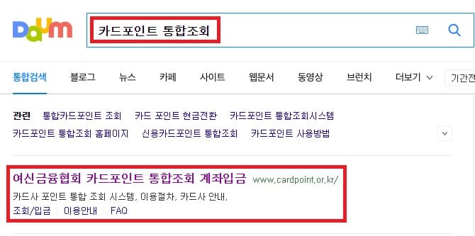 1. 먼저 검색창에 카드포인트 통합조회를 검색하고 맨 위에 보이는 사이트를 클릭합니다. 링크를 걸어두었으니 여기서 바로 접속하셔도 됩니다.