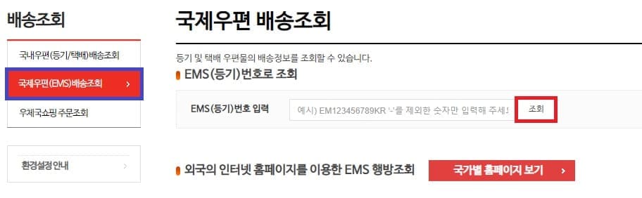 1. 국제우편(EMS) 배송조회 탭을 클릭합니다.