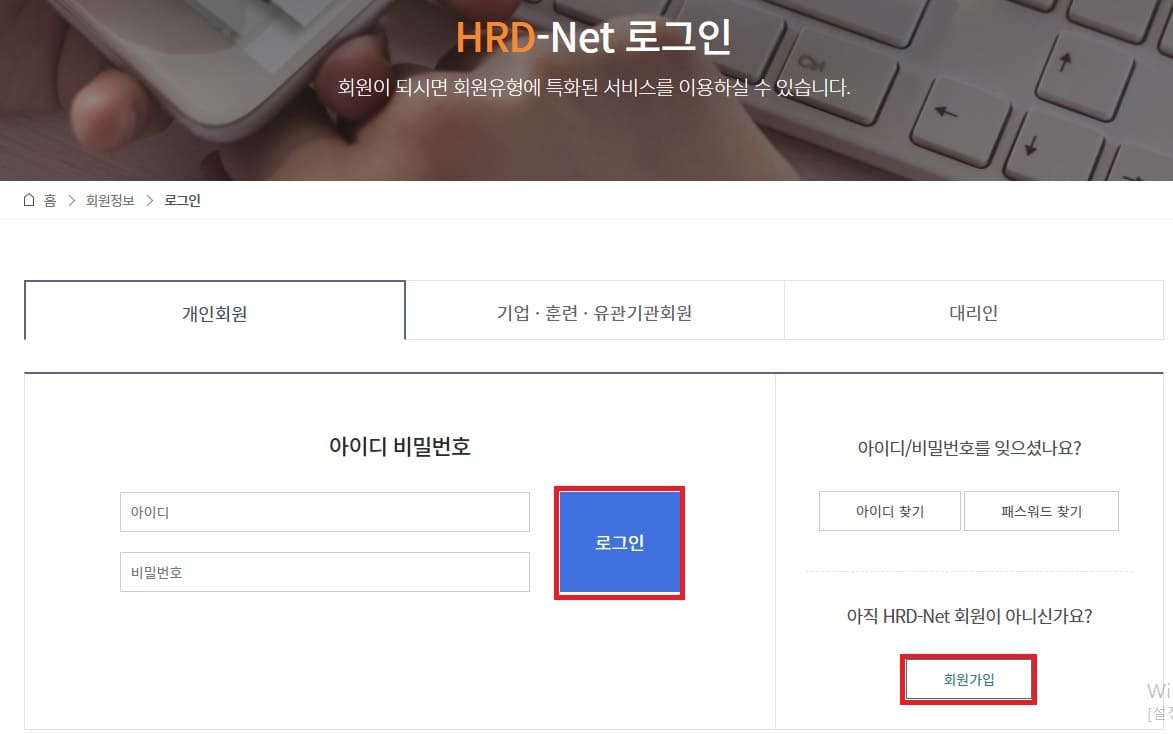 3. HRD-Net에 로그인 하시거나 회원가입을 하시고 로그인을 합니다.