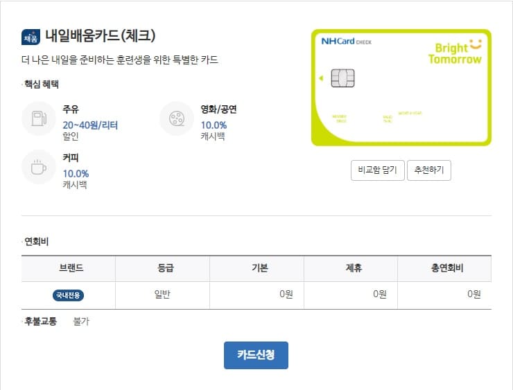 다음으로 내일배움카드 농협 혜택입니다. 대표적인 혜택은 주유 20~40/리터 할인과 영화/공영 10% 캐시백, 커피 10% 캐시백 등이 있습니다. 이것도 마찬가지로 전월 실적에 따라 달라지니 참고하시기 바랍니다.