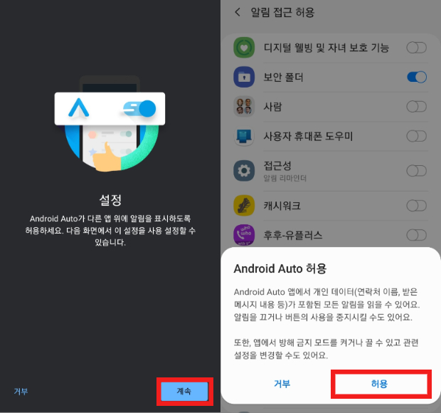 5. 안드로이드 오토가 다른 앱 위에 알림을 표시하도록 설정합니다. 계속을 클릭하시면 허용 화면으로 넘어가게 됩니다. 허용을 클릭하시면 연결이 완료됩니다.