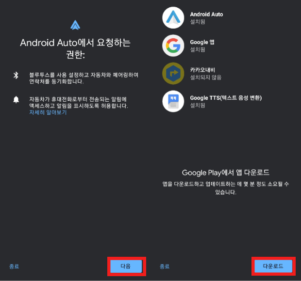3. 안드로이드 오토 필수 어플을 설치합니다. 아직 설치되지 않았다면 다운로드를 클릭합니다.