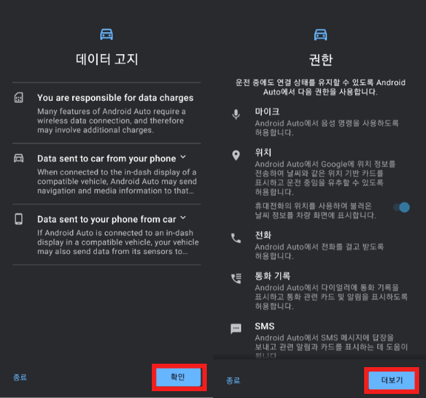 4. 데이터 고지에 관한 내용과 권한에 관한 내용입니다. 각각 확인과 더보기를 클릭합니다.