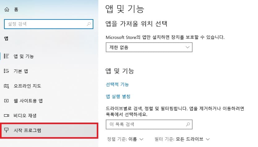 3. 다음으로 왼쪽 메뉴에 맨 밑의 시작 프로그램을 클릭합니다.