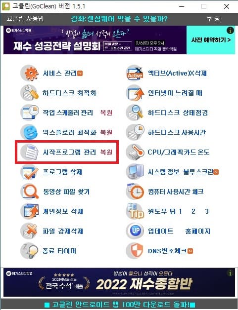 고클린 다운로드 하신 후 실행하시면 시작프로그램 관리라는 항목이 있습니다. 여기에 들어가시면 시작 프로그램에 대하여 설정하실 수 있습니다. 필요 없는 것은 삭제해주시는 것이 좋습니다.