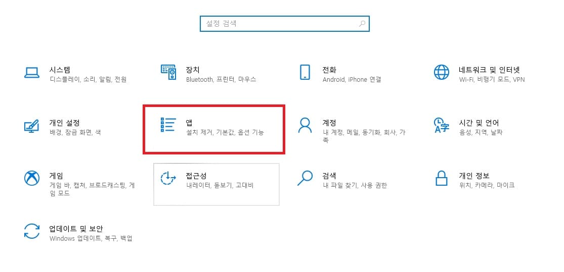 2. 설정 창에서 가운데에 있는 앱을 클릭합니다.