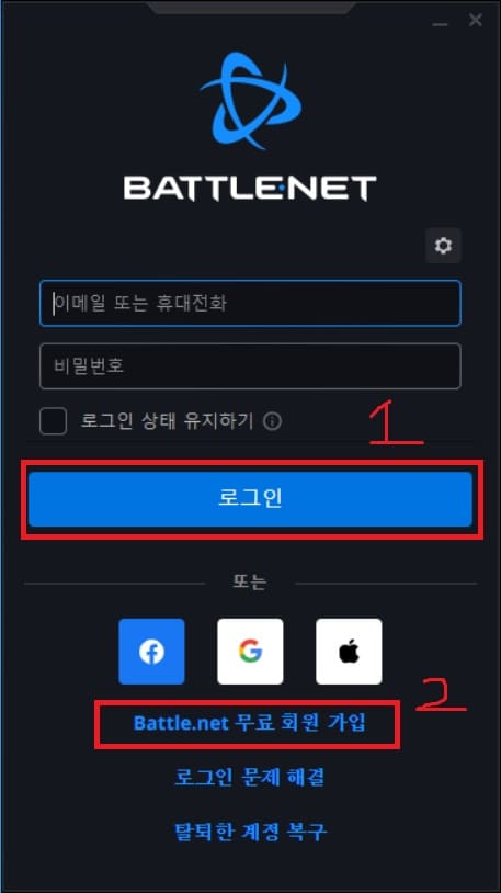 계정이 없으신 분들은 Battle.net 무료 회원 가입을 클릭하여 회원 가입 후 이용해주시면 됩니다.