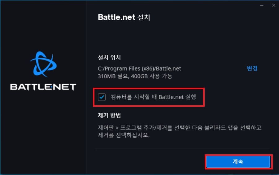 체크 항목 컴퓨터를 시작할 때 Battle.net 실행 항목을 확인하여 주시고 계속을 클릭합니다.
