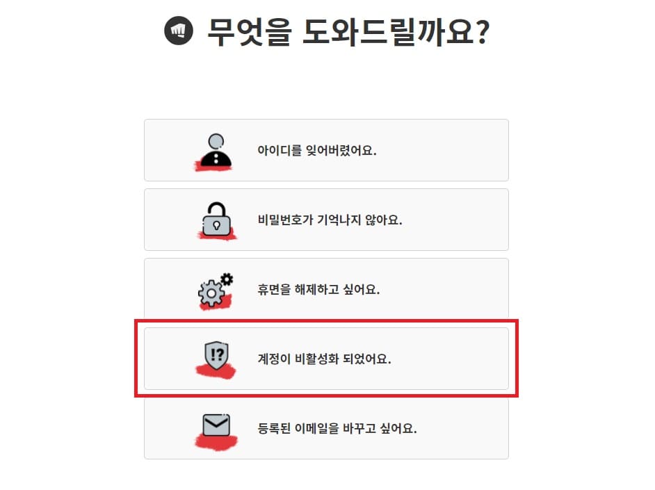 링크를 클릭하시면 위 사진과 같은 화면이 나옵니다. [계정이 비활성화 되었어요.]를 선택합니다.