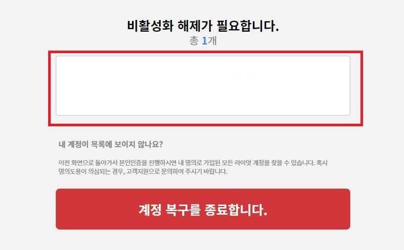 인증이 완료되면 휴면계정이나 비활성화된 계정 목록이 나옵니다. 비활성화된 계정을 선택하여 다음 단계로 진행합니다.