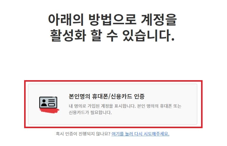 휴대폰 인증이나 카드 인증으로 진행합니다. 저는 휴대폰 인증이 더 편해서 휴대폰 인증으로 진행했습니다.