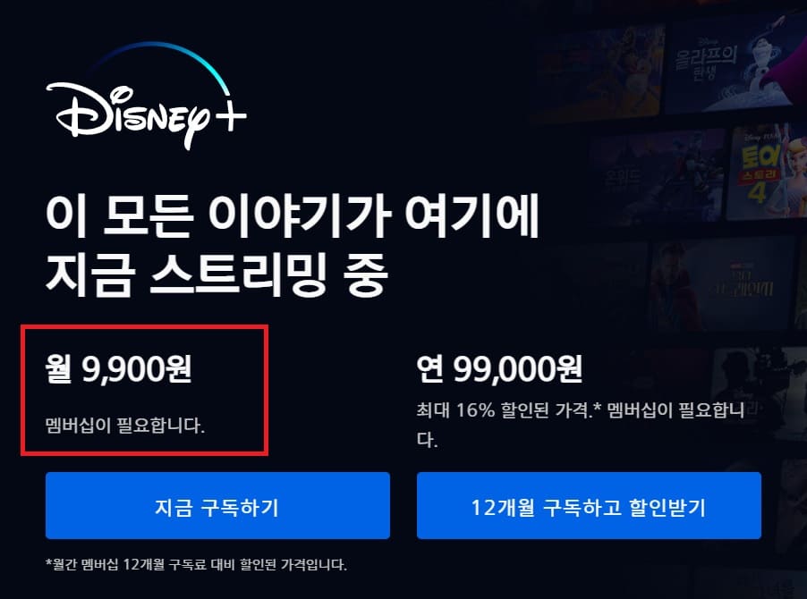 디즈니플러스 가격은 단일요금제로 월 9,900원이며, 연간으로는 99,000원으로 16% 할인된 가격에 이용 가능합니다.