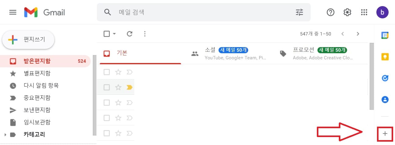 3. Gmail을 클릭하시면 이렇게 화면이 나옵니다. 우측 아래쪽에 있는 [+] 표시를 클릭합니다.