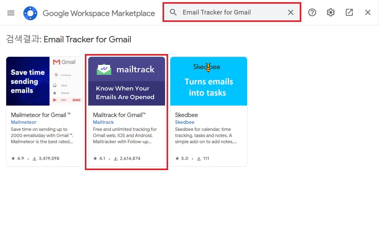 4. 화면 검색창에 Email Tracker 를 검색하여 [Email Tracker for Gmail]을 선택합니다.