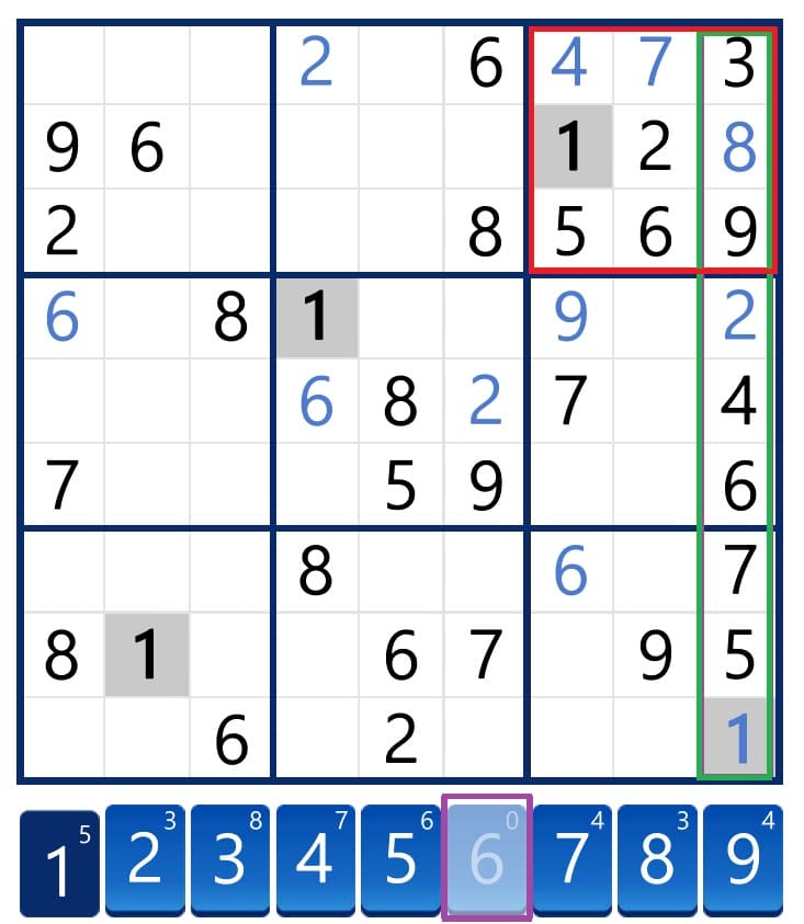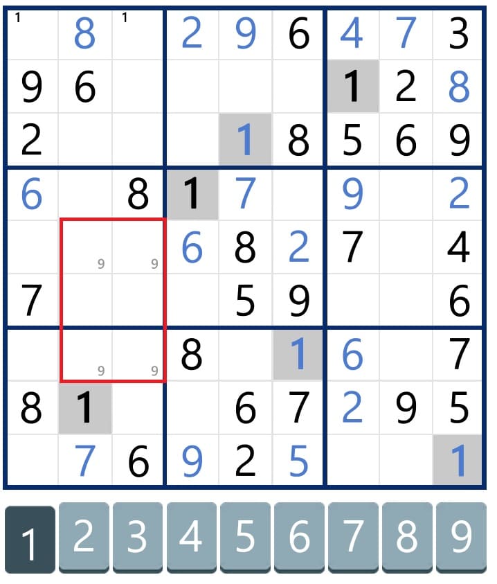 예를 들어, 위 사진에서 처럼 보라색 줄은 9가 중복되어 들어갈 수 없으므로 빨간 칸에 9가 들어갈 수 있습니다.