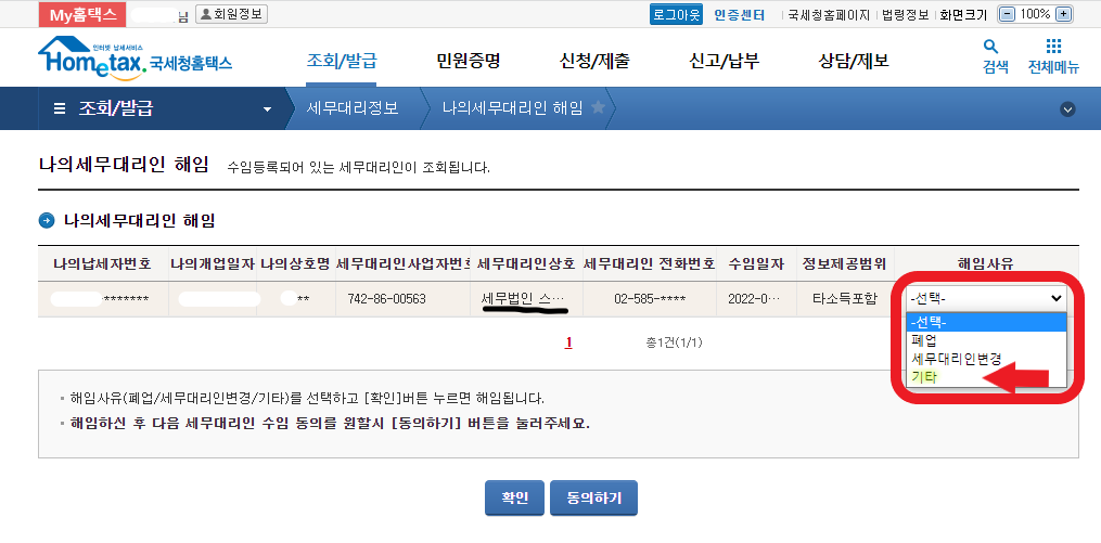 [홈택스 로그인] - [조회/발급] - [나의세무대리인해임] - [해임사유-기타] - [해임]