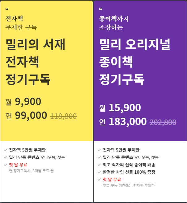 밀리 오리지널 책들의 종이책까지 정기 구독할 수 있습니다.