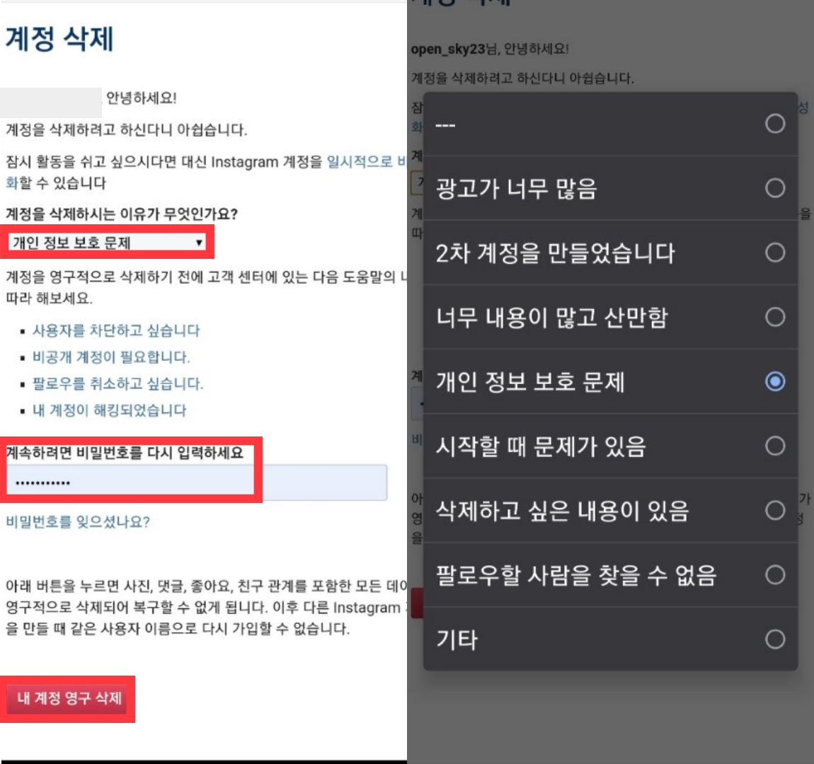 이렇게 하면 계정이 삭제됩니다~ 우측 사진에는 계정을 삭제하려는 이유가 나와있으나 그냥 참고만 하세요~