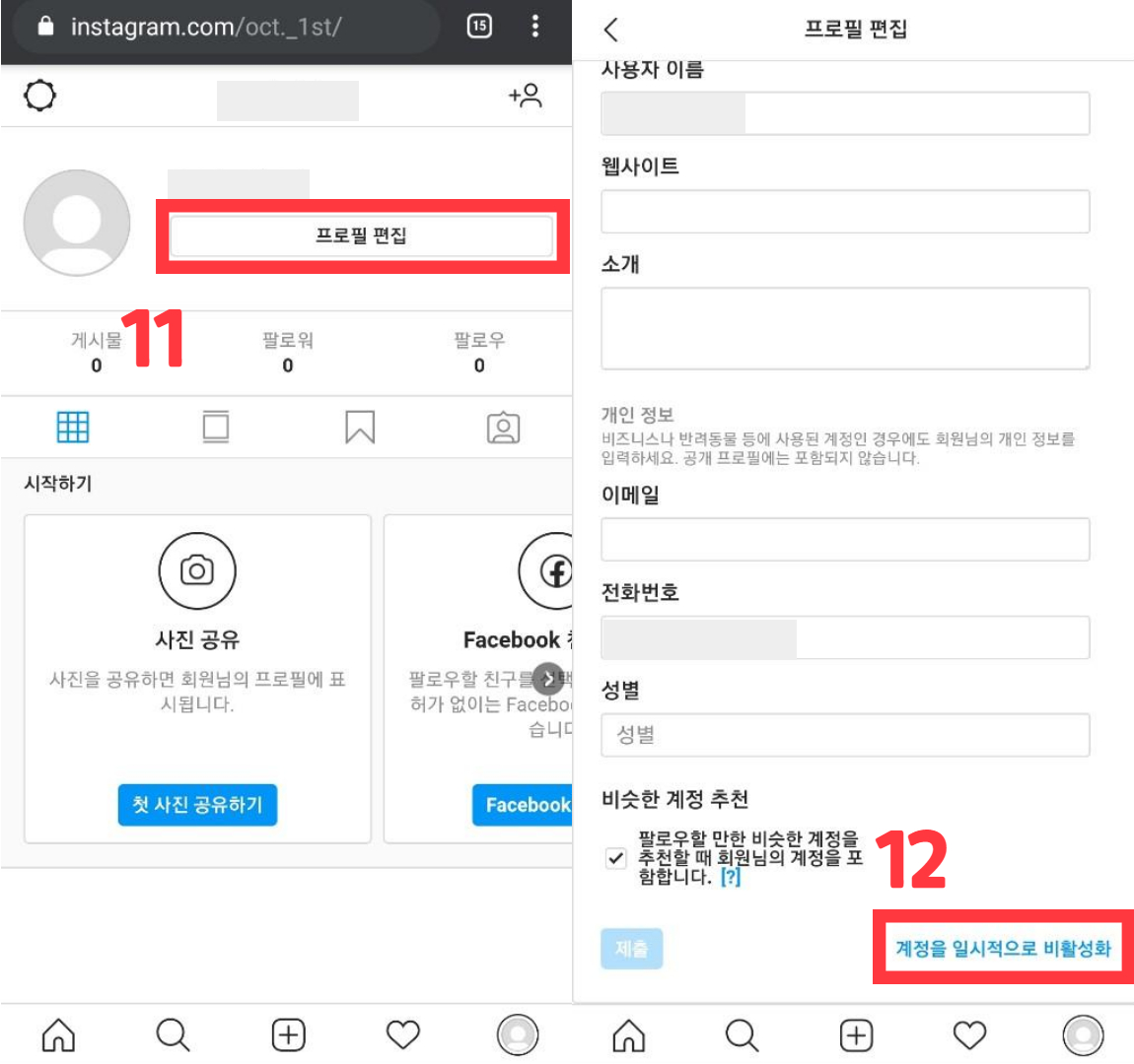12. 프로필 편집에서 우측 하단에 보이는 '계정을 일시적으로 비활성화' 클릭